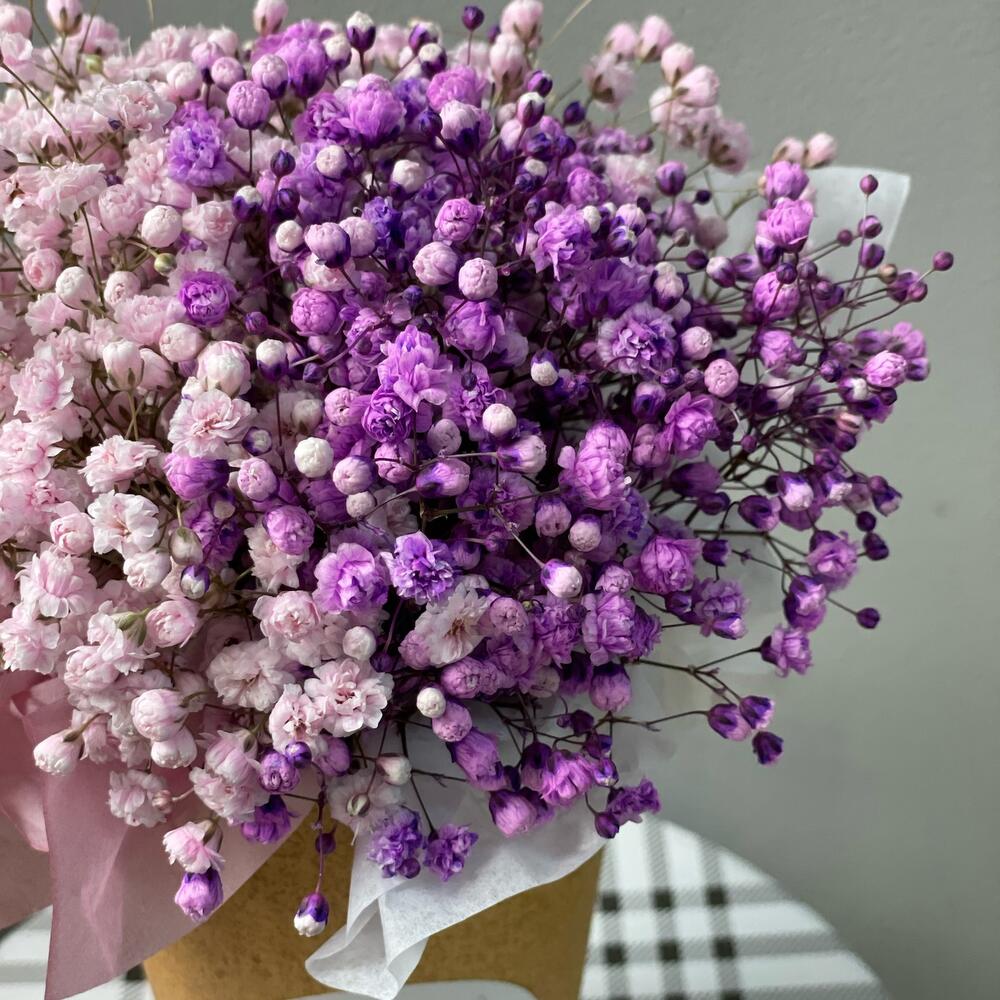 Композиция в стакане с разноцветной гипсофилой Гипсофила со временем превращается в сухоцвет и будет радовать своего получателя долгое время