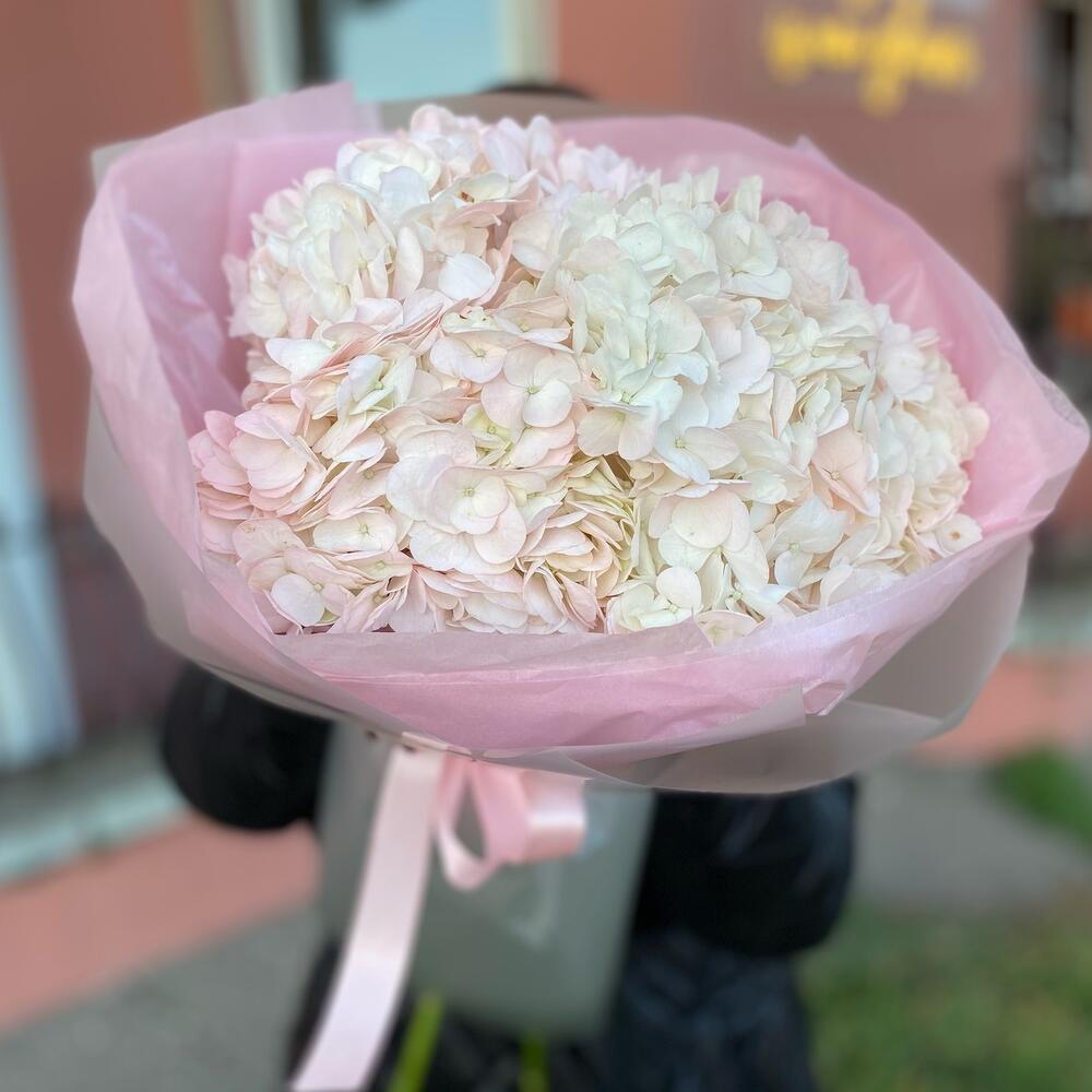 Гортензия – 3 шт. Атласная лента – 1 шт. Тишью – 1 шт. Пленка дизайнерская – 1 шт.