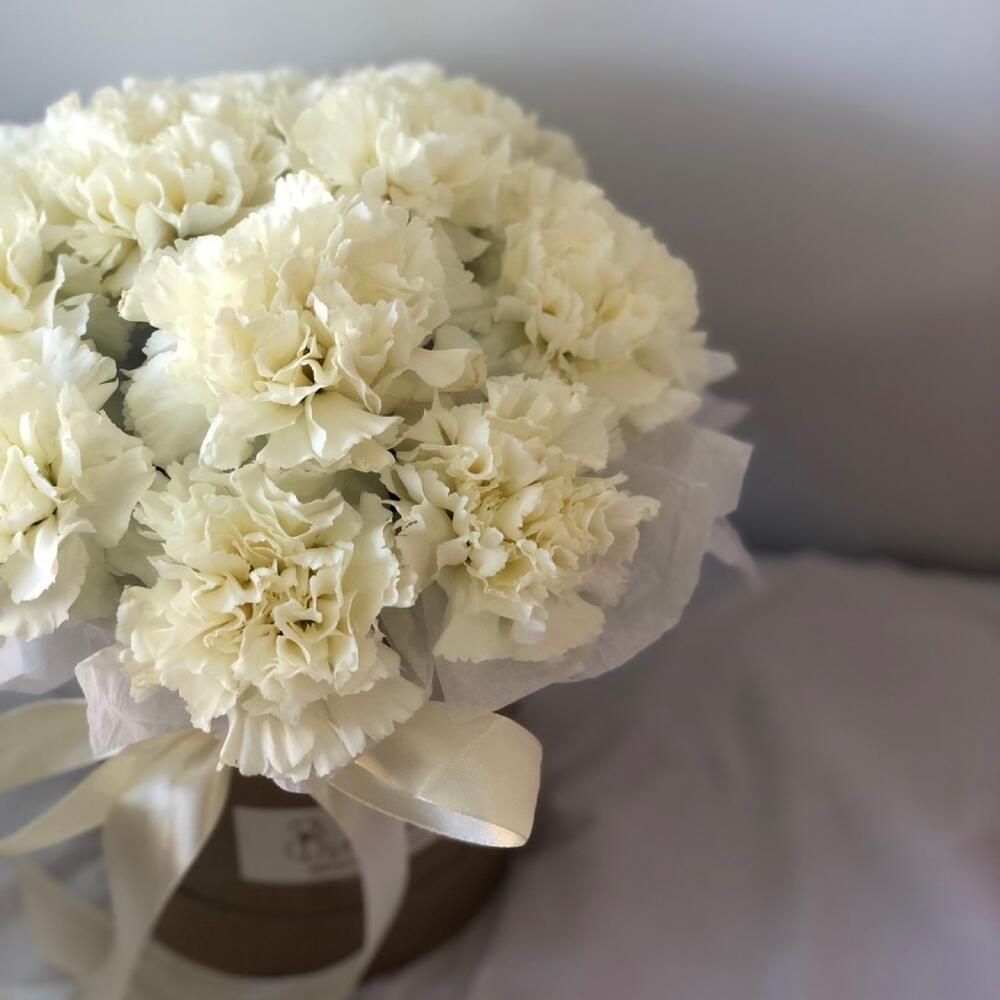 11 белых гвоздик в шляпной коробке