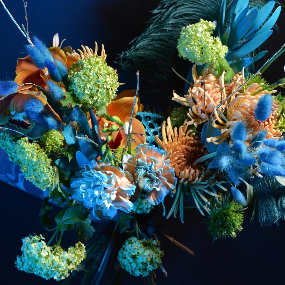 цимбидиум ветка – 1 шт.Хризантема – 4 шт.Гвоздика – 5 шт.Вибурнум – 3 шт.леукондендрон – 3 шт.мелкоцвет – 5 шт.Сухоцветы – 10 шт.