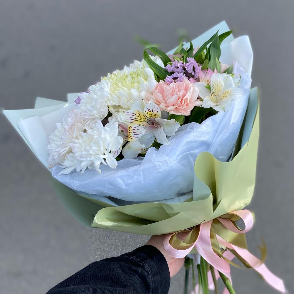 Альстромерия – 4 шт.Хризантема кустовая – 2 шт.Лента атласная – 5 шт.Диантус – 4 шт.Сантини – 3 шт.Упаковка дизайнерская – 7 шт.магнум белый – 1 шт.