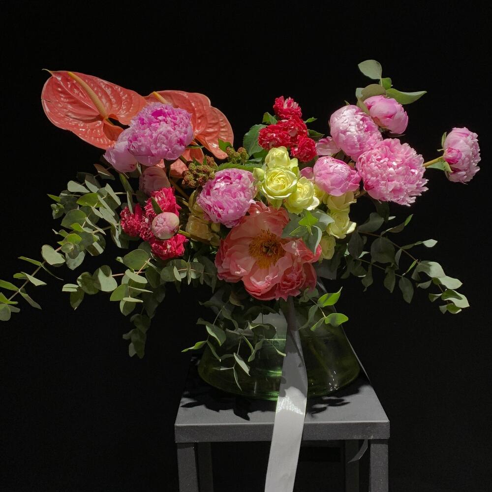 Альстромерии, Гвоздики, Кустовые розы, Лизиантусы, Розы, Хризантемы