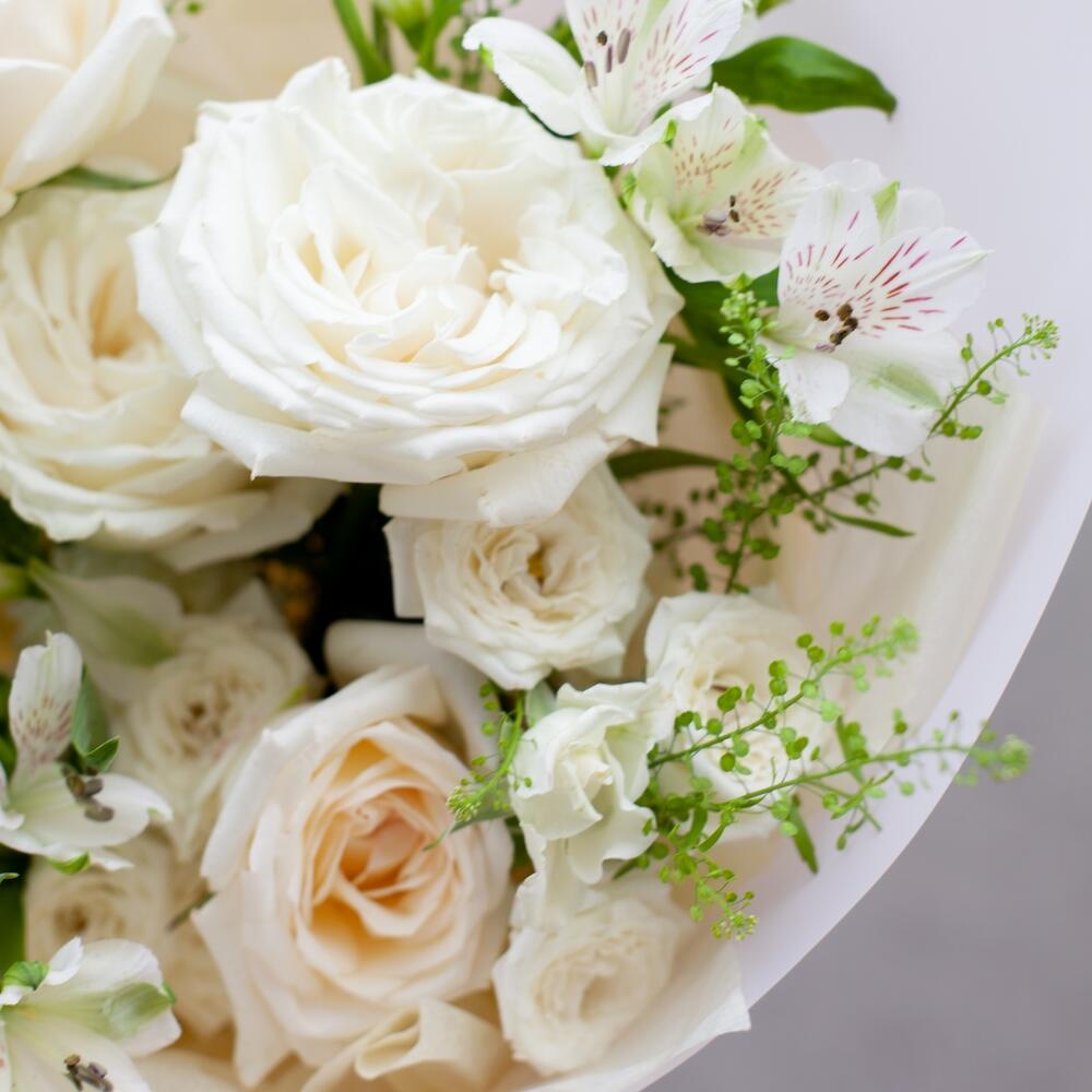 Альстромерия – 2 шт.Роза кустовая – 1 шт.Роза пионовидная – 5 шт.Гринбелл – 1 шт.Упаковка дизайнерская – 1 шт.