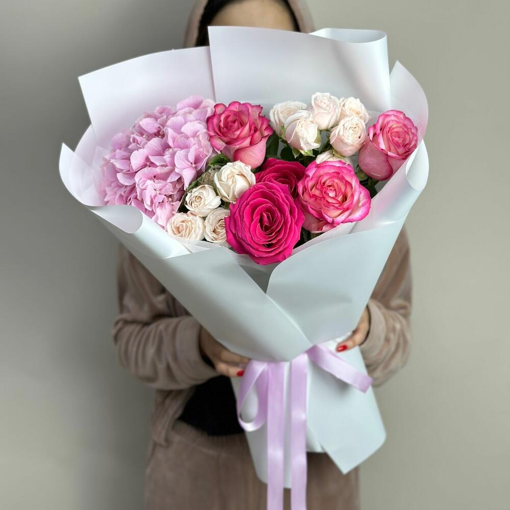 Альстромерии, Гвоздики, Кустовые розы, Лизиантусы, Розы, Хризантемы