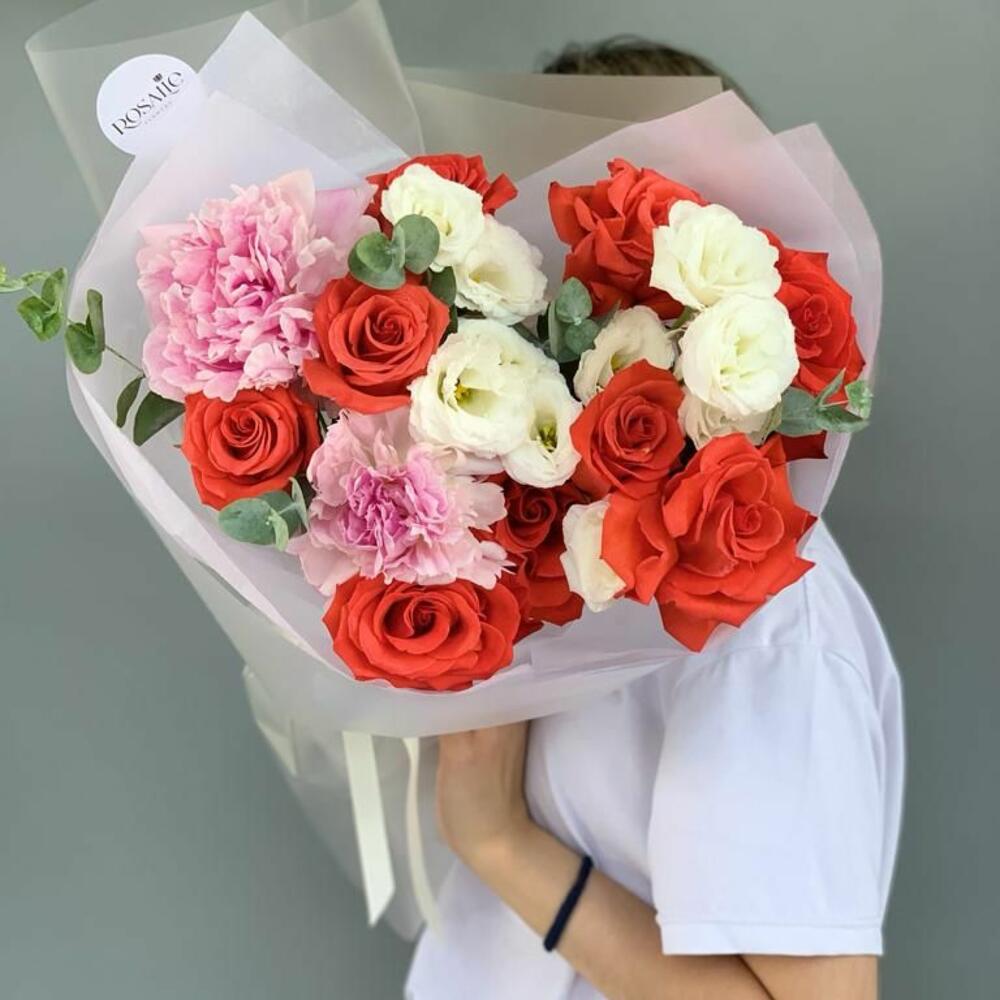 Гвоздики, Лизиантусы, Розы, Тюльпаны
