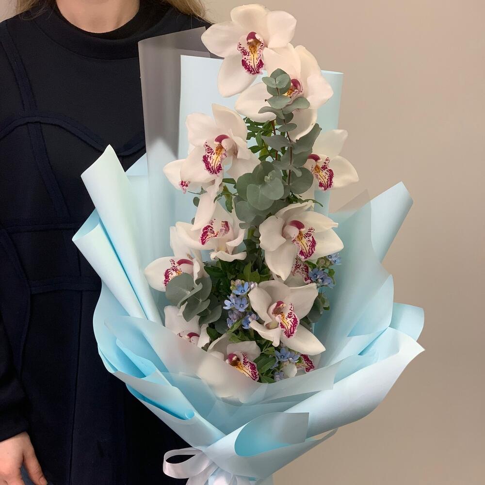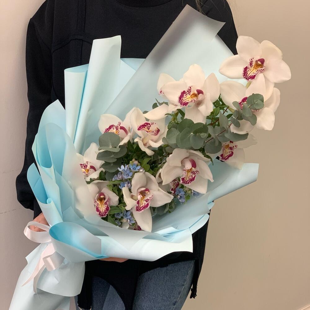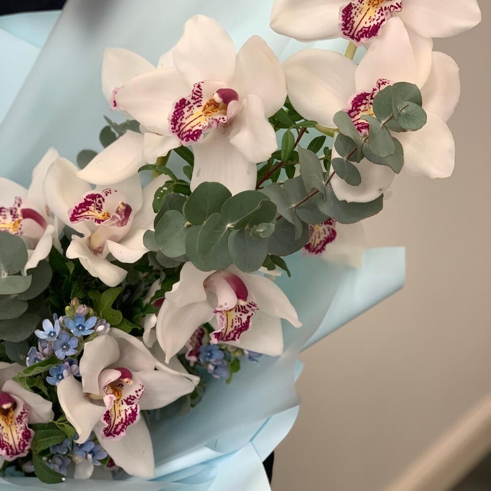 орхидея – 1 шт.Твидия – 3 шт.Дизайнерская упаковка – 3 шт.Эвкалипт – 1 шт.Зелень – 2 шт.