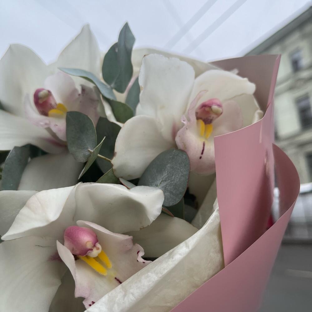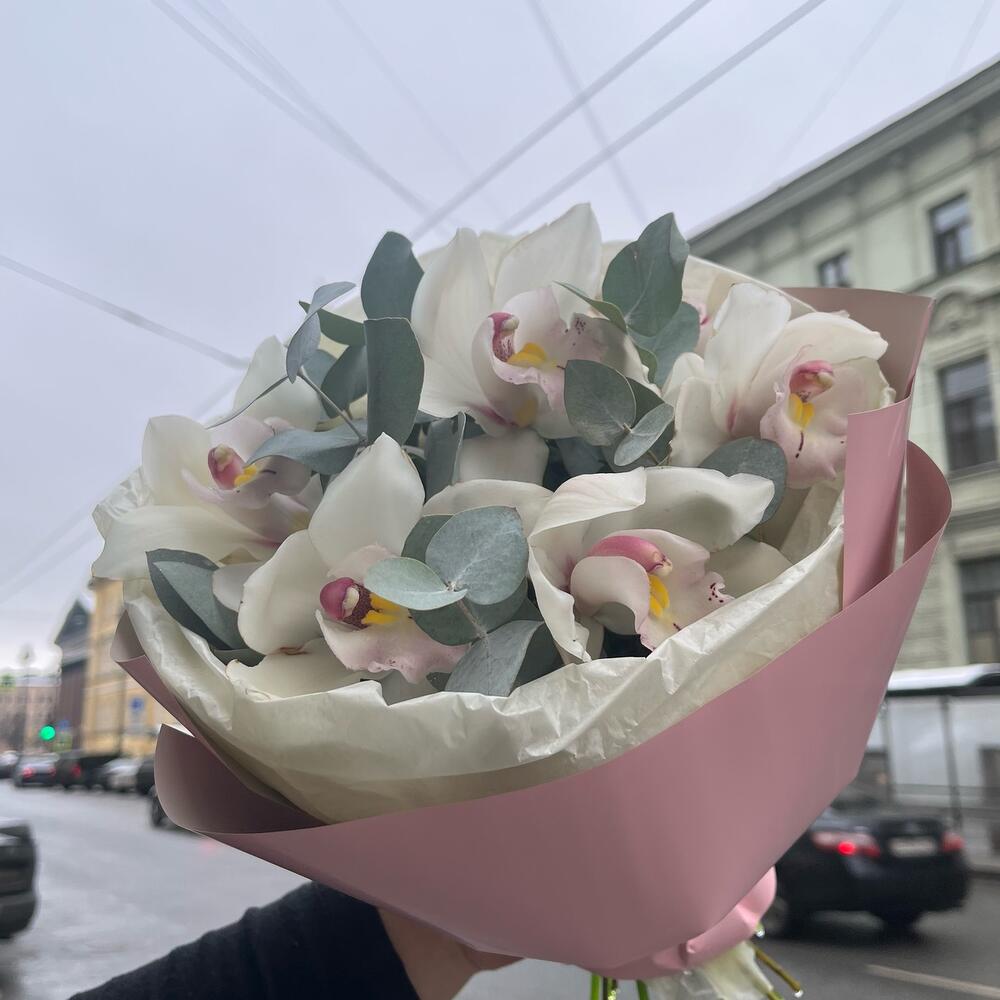 Эвкалипт – 4 шт.Лента атласная – 1 шт.Тишью – 1 шт.удлинитель для орхидеи – 7 шт.Упаковка корейская пленка – 1 шт.премиум орхидея цимбидиум – 7 шт.