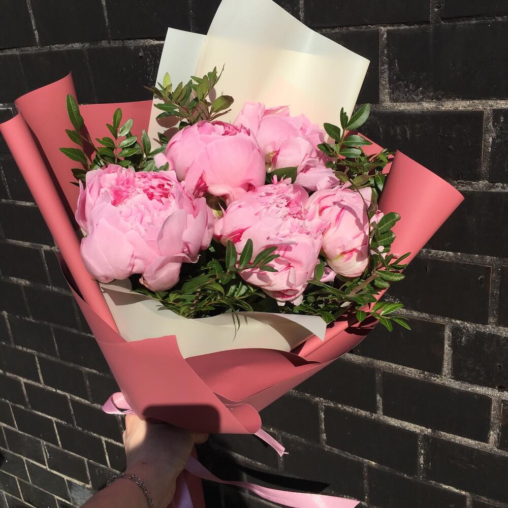 Букет из 5 пионов с зеленью