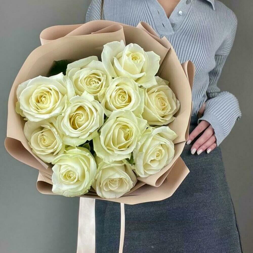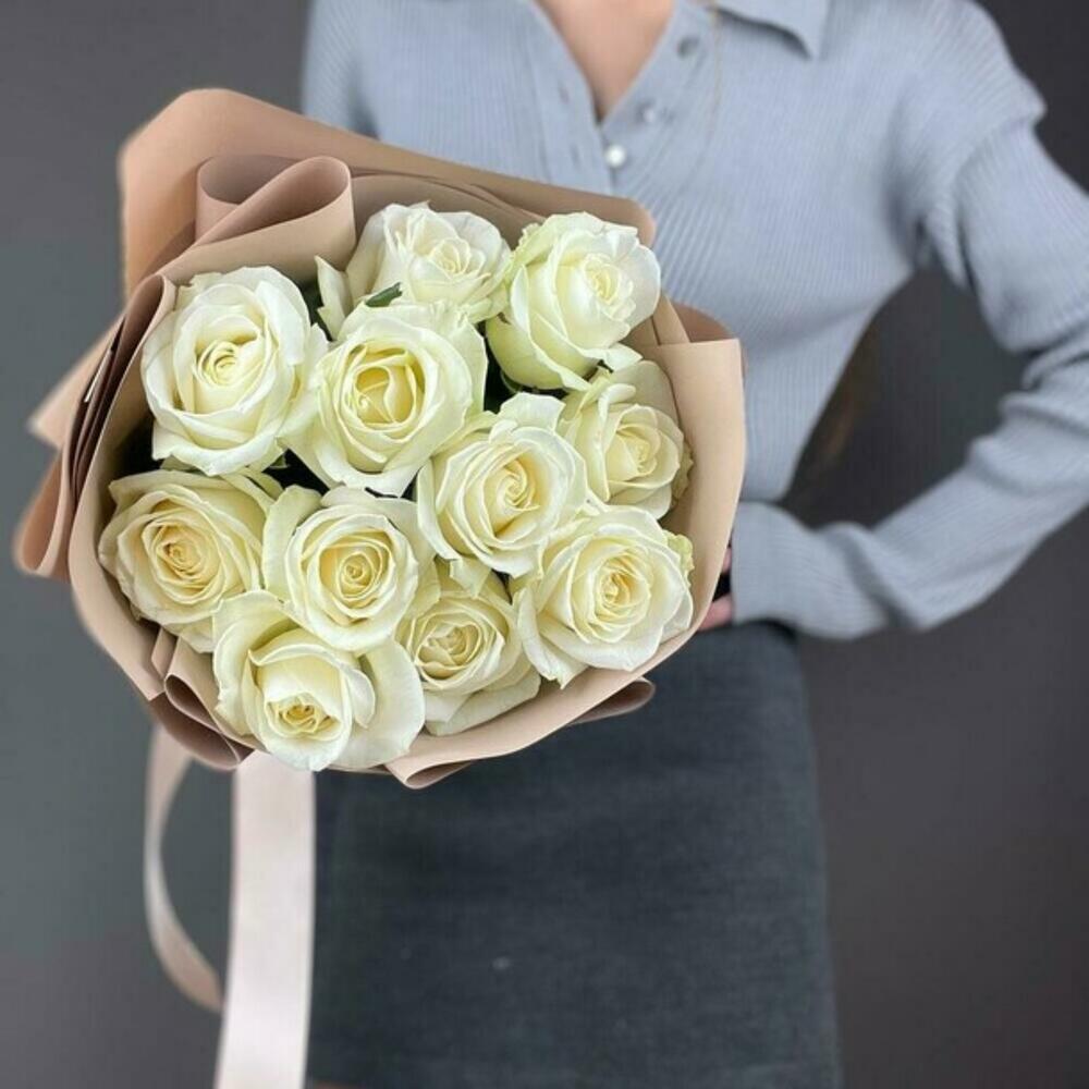 Нежный букет из 11 белых роз в стильном оформлении понравится каждой девушке.