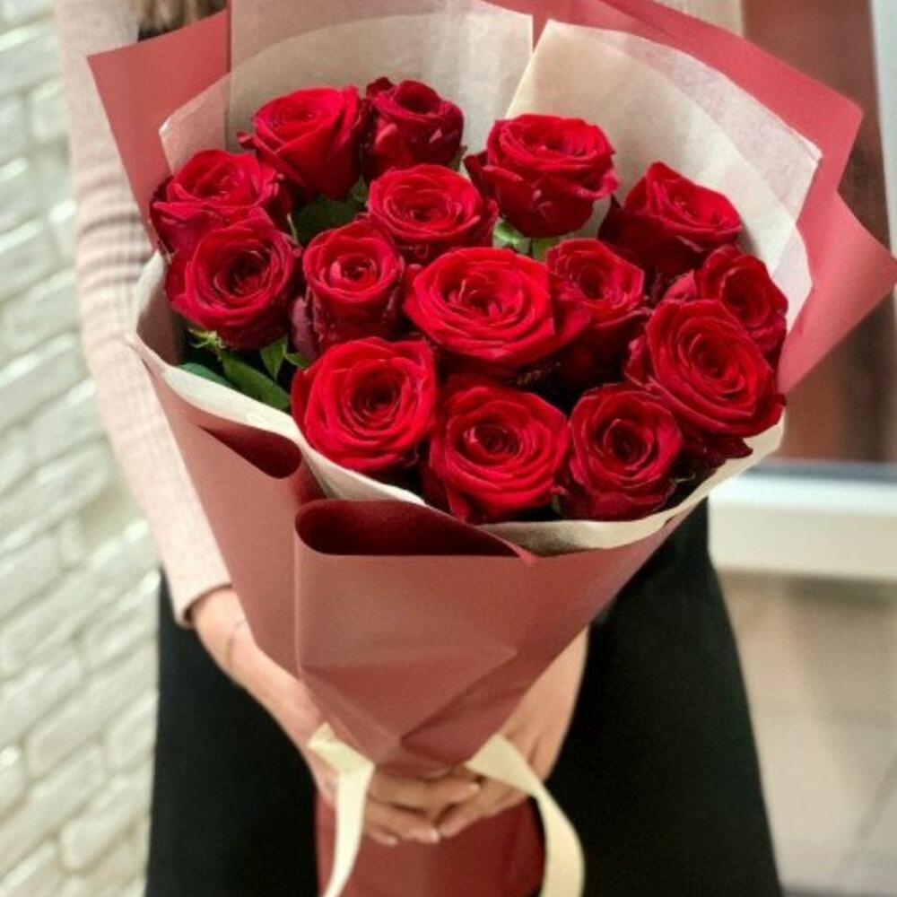 Атласная лента – 1 шт. Красная роза – 15 шт. Современная упаковка – 1 шт.