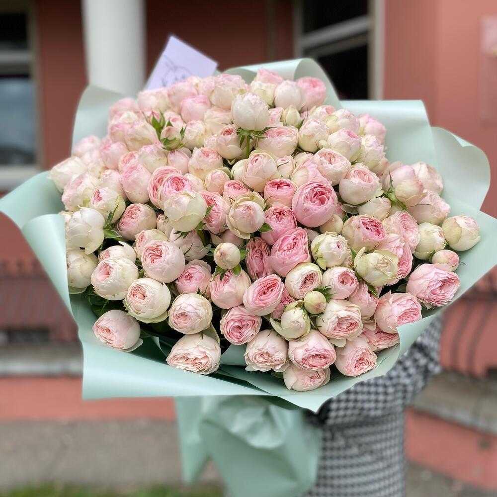 Букет из 35 кустовых пионовидных веток сорта Mansfield park в дизайнерском оформлении. Количество розочек(бутонов) может достигать 171 штучки