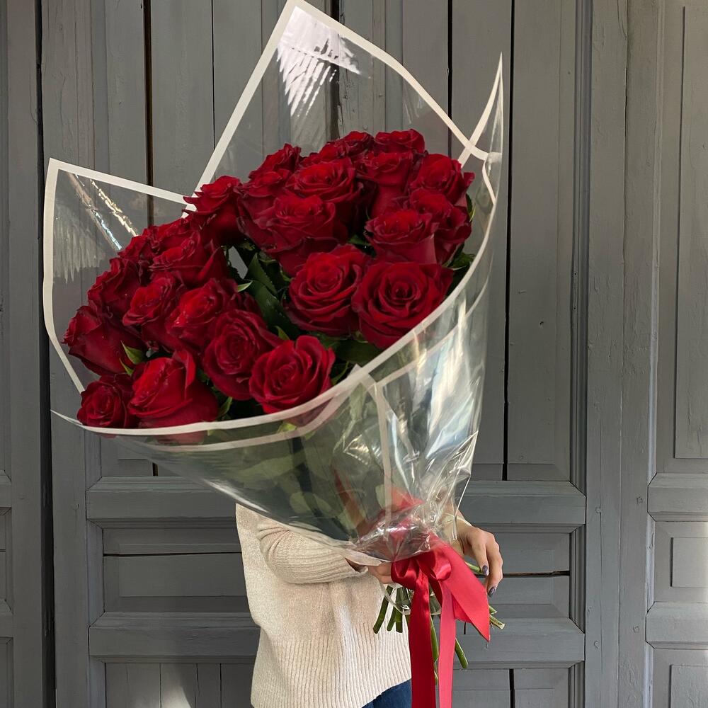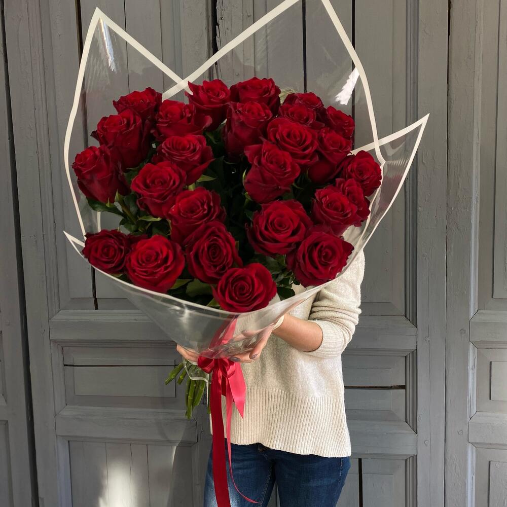 Роза Эквадор 70 см – 25 шт.Упаковка дизайнерская – 3 шт.Лента атласная – 1 шт.