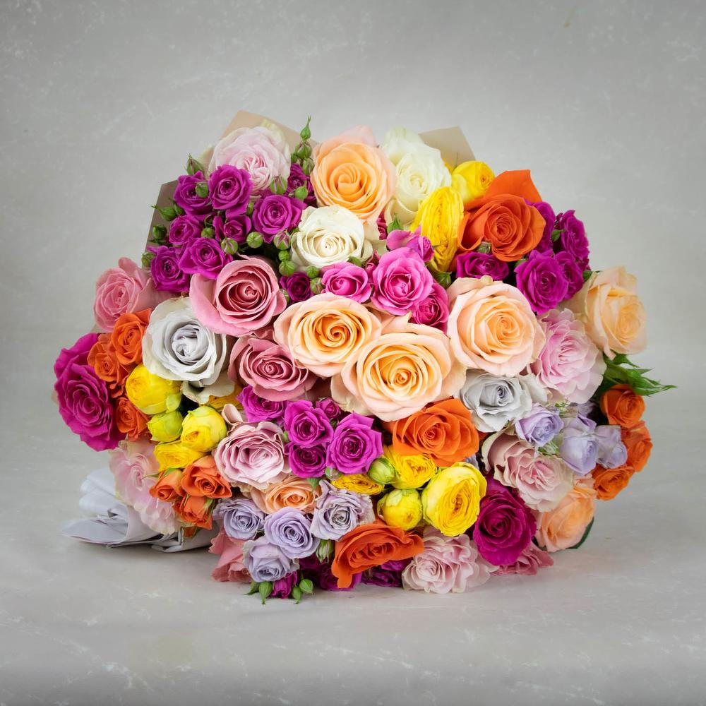 purple rose – 3 шт. purple spray rose – 4 шт. yellow spray rose – 3 шт. orange rose – 3 шт. orange spray rose – 3 шт. light orange rose – 5 шт. Pink rose – 5 шт. White rose – 2 шт. grey rose – 2 шт.