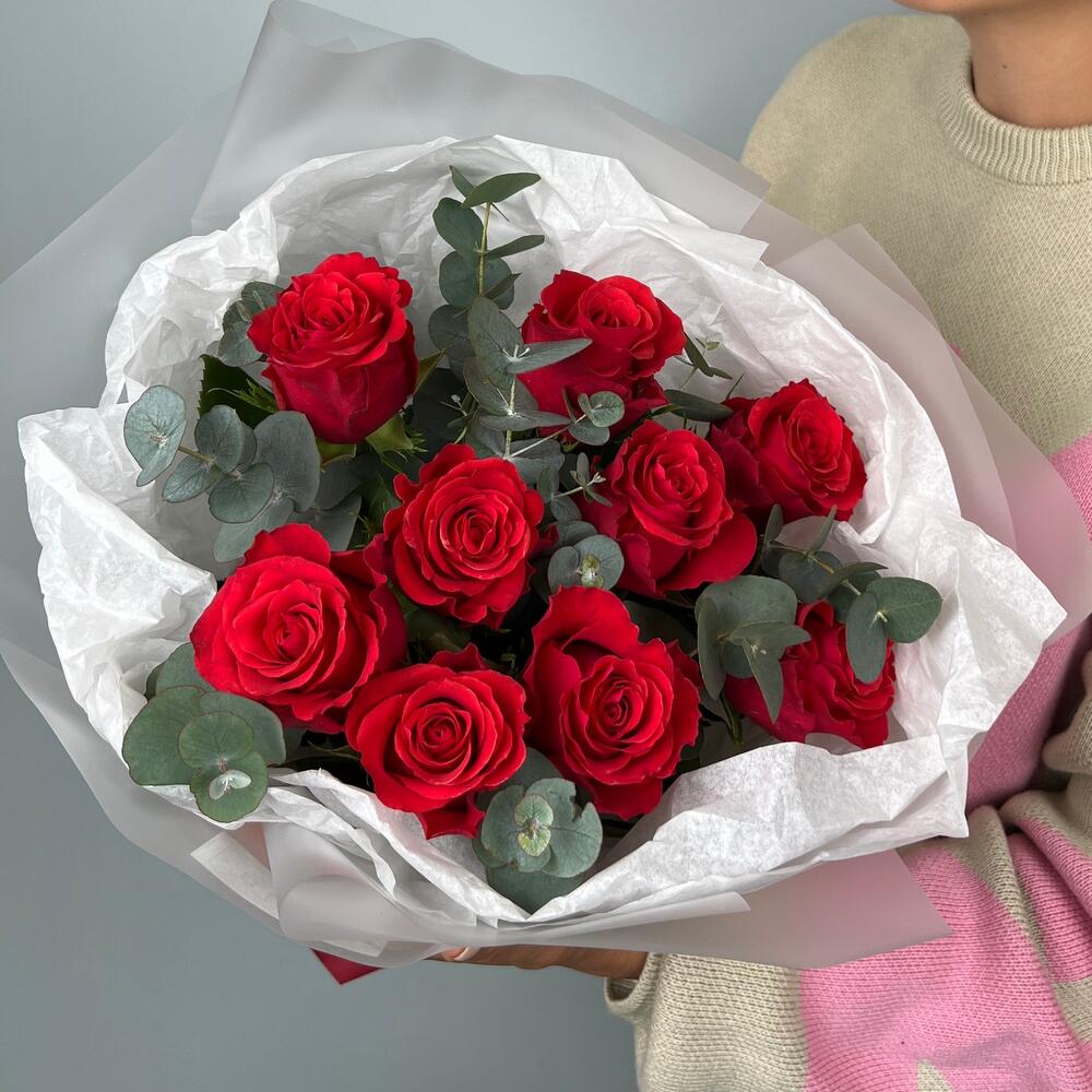 Роза красная – 9 шт.Эвкалипт – 3 шт.Лента атласная – 1 шт.Дизайнерская упаковка – 1 шт.