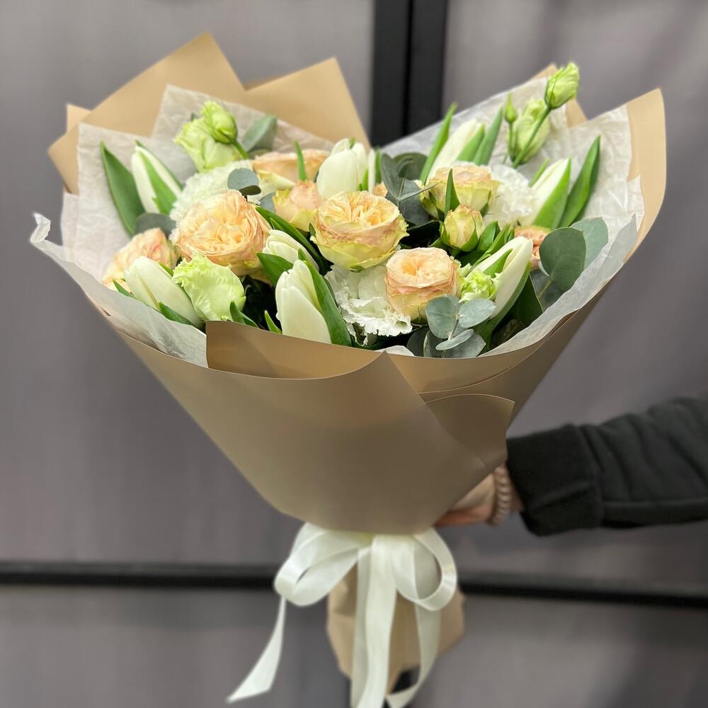 Эвкалипт – 2 шт.Лента атласная – 2 шт.Тишью – 2 шт.Тюльпан белый – 9 шт.Пленка матовая – 3 шт.Эустома белая махровая – 1 шт.роза кустовая пионовидная трендсеттер – 2 шт.
