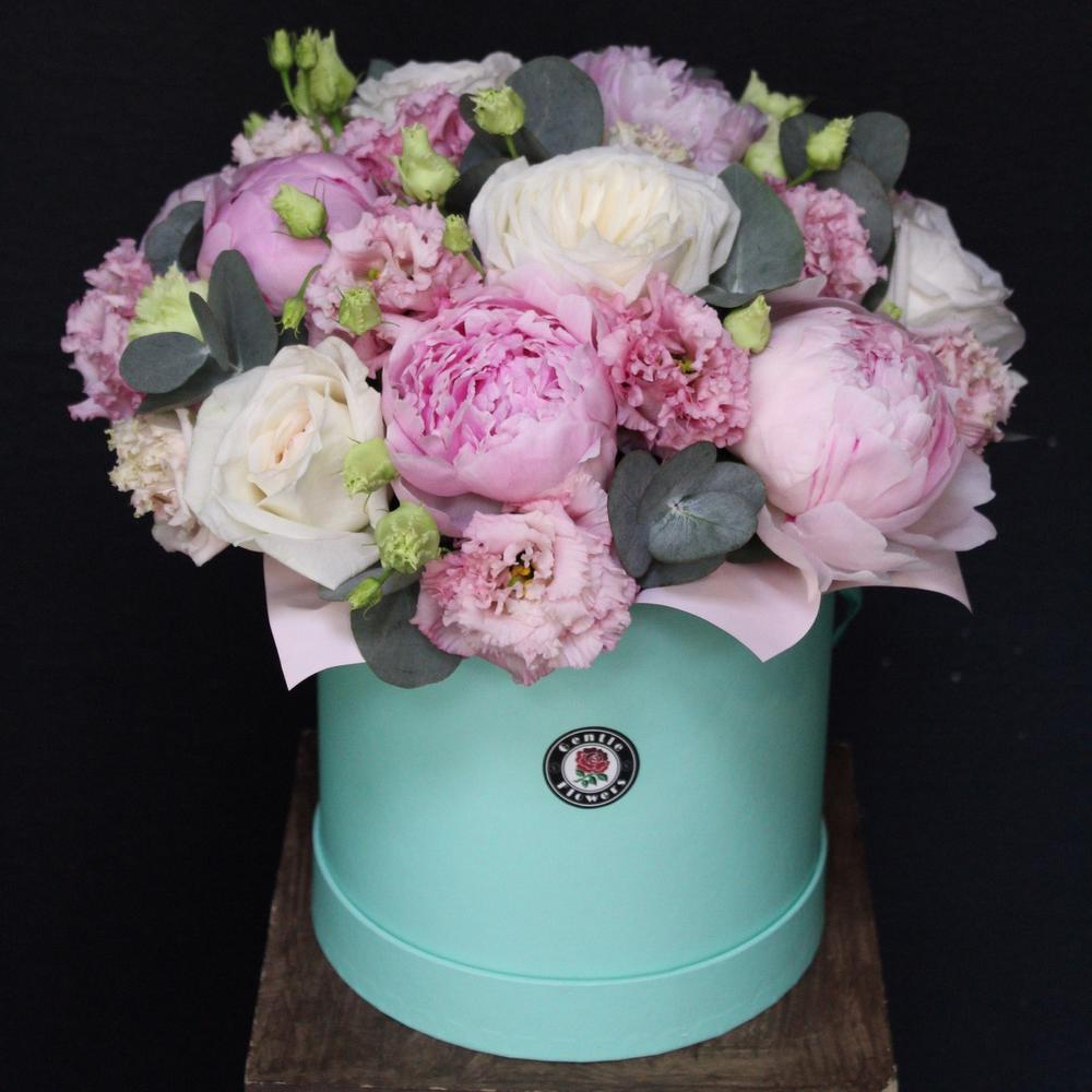Эвкалипт – 3 шт.Эустома – 3 шт.Коробка шляпная – 1 шт.Роза пионовидная – 5 шт.Пион Сара Бернар – 7 шт.Логотип – 1 шт.Пленка матовая – 1 шт.Оазис флористический – 1 шт.