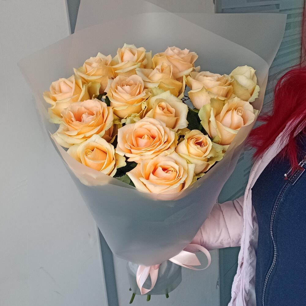 Лента атласная – 1 шт.Упаковка дизайнерская – 3 шт.роза пич аваланж 60 см – 15 шт.