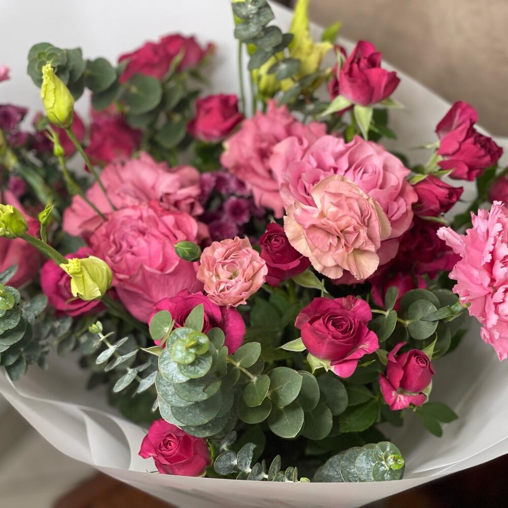 Кустовая роза – 4 шт.Хризантема Сантини – 2 шт.Эвкалипт – 3 шт.Лизиантус – 2 шт.Роза одноголовая – 3 шт.Гвоздика – 3 шт.
