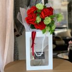 Букет «Английский сад» с алыми розами в фирменной упаковке