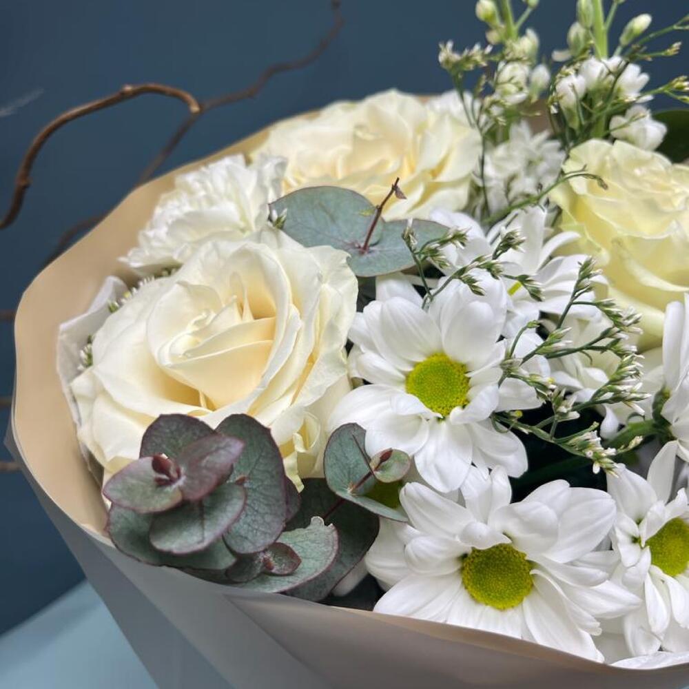 Лимониум – 1 шт.Маттиола – 2 шт.Хризантема кустовая – 1 шт.Эвкалипт – 3 шт.Роза одноголовая – 3 шт.Гвоздика – 2 шт.Упаковка дизайнерская – 2 шт.