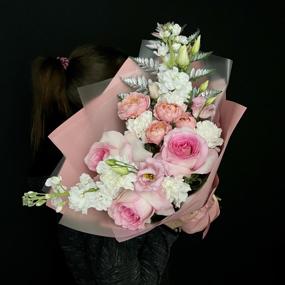 Маттиола – 2 шт.Папоротник – 1 шт.Эустома – 1 шт.Диантус – 4 шт.Пионовидная роза – 3 шт.Пионовидная кустовая роза – 1 шт.Дизайнерская упаковка – 3 шт.