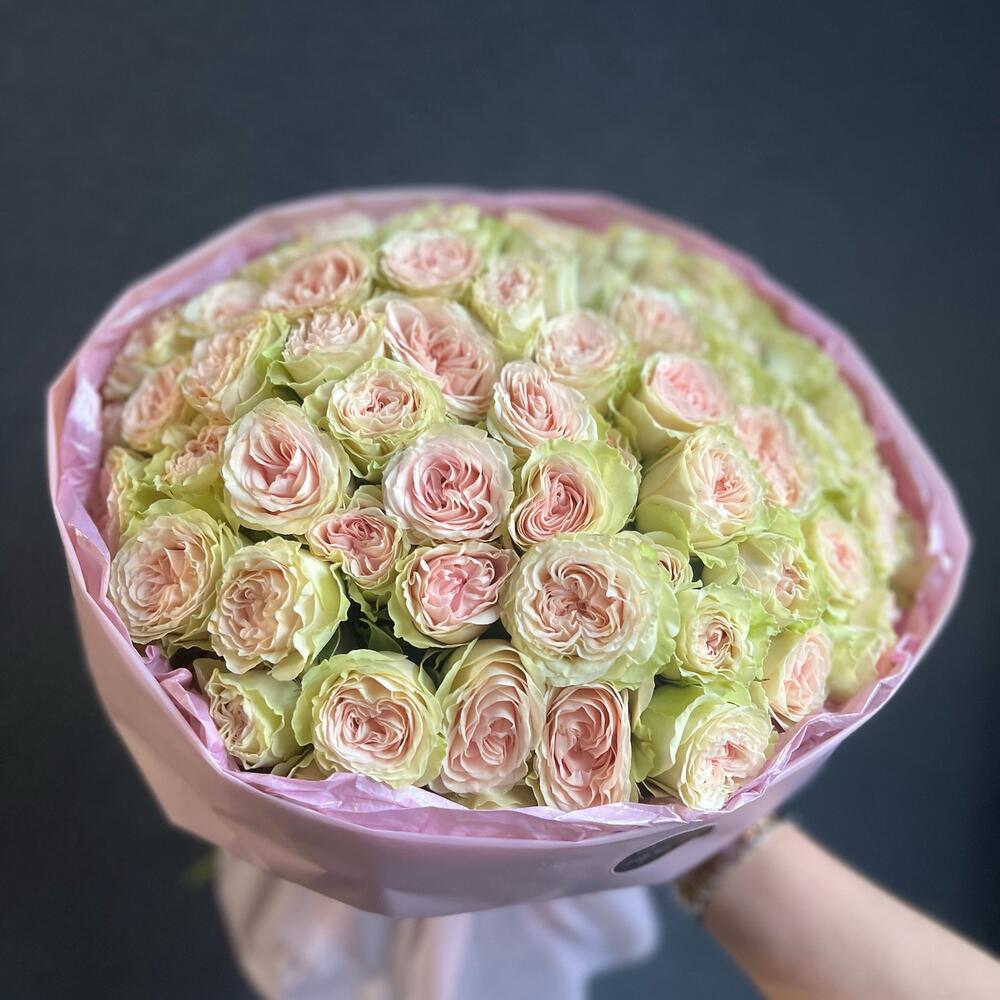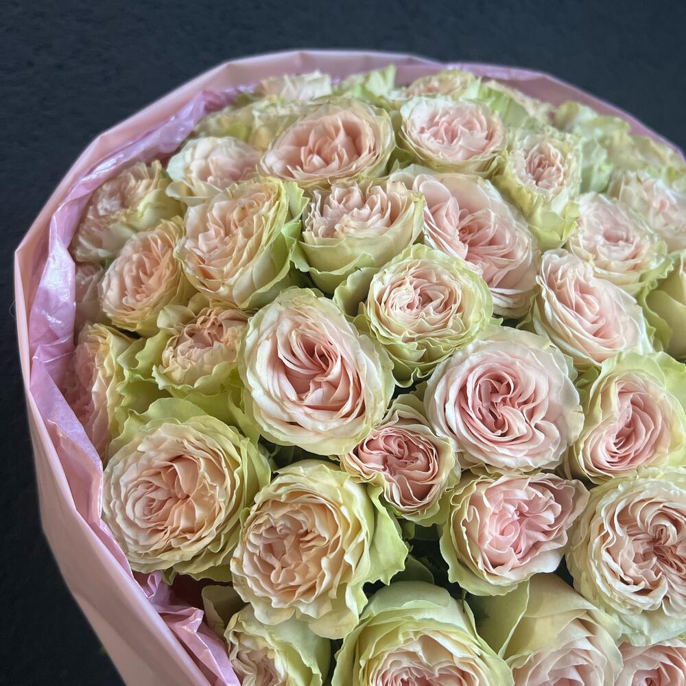Атласная лента – 1 шт.Кустовая пионовидная роза – 25 шт.декоративная упаковка – 1 шт.