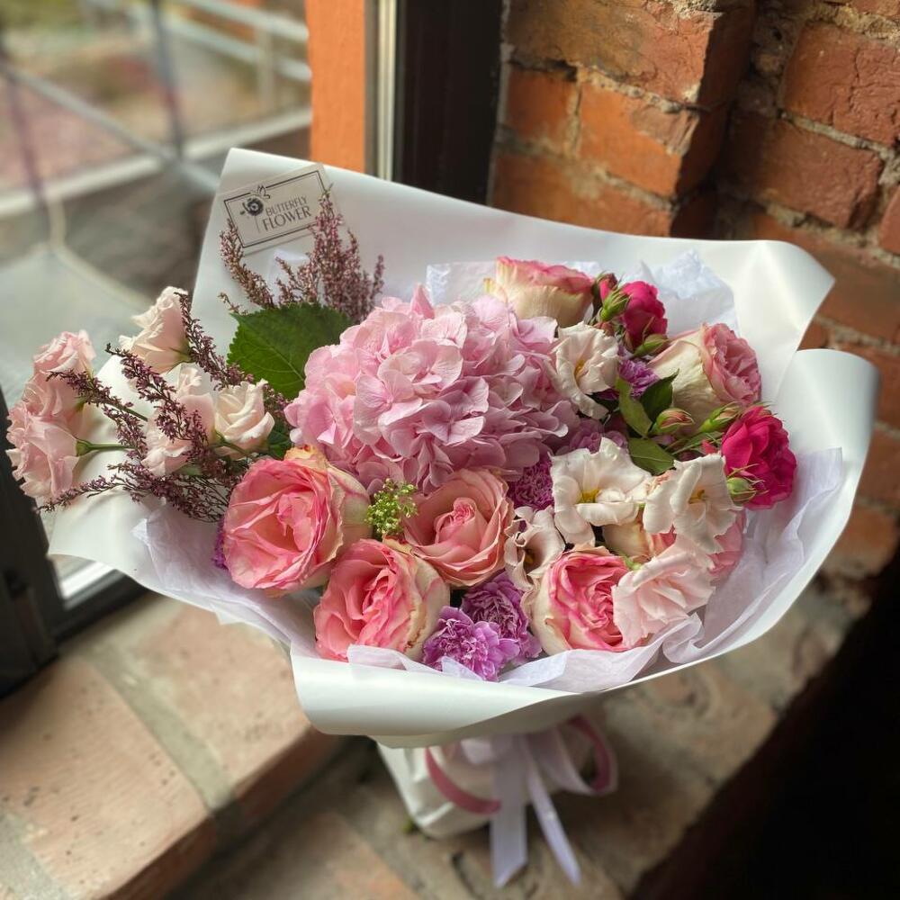 Букет из гортензии, роз, эустомы, вереска, диантусов, кустовых пионовидных роз и седума в стильной упаковке “Ньюкасл”
