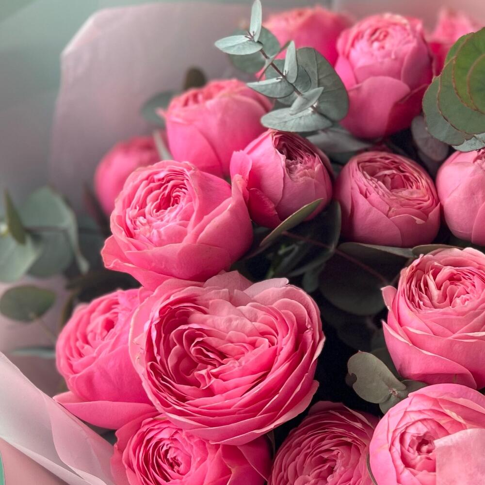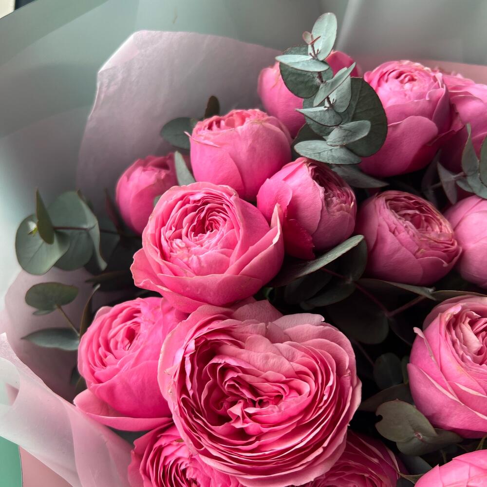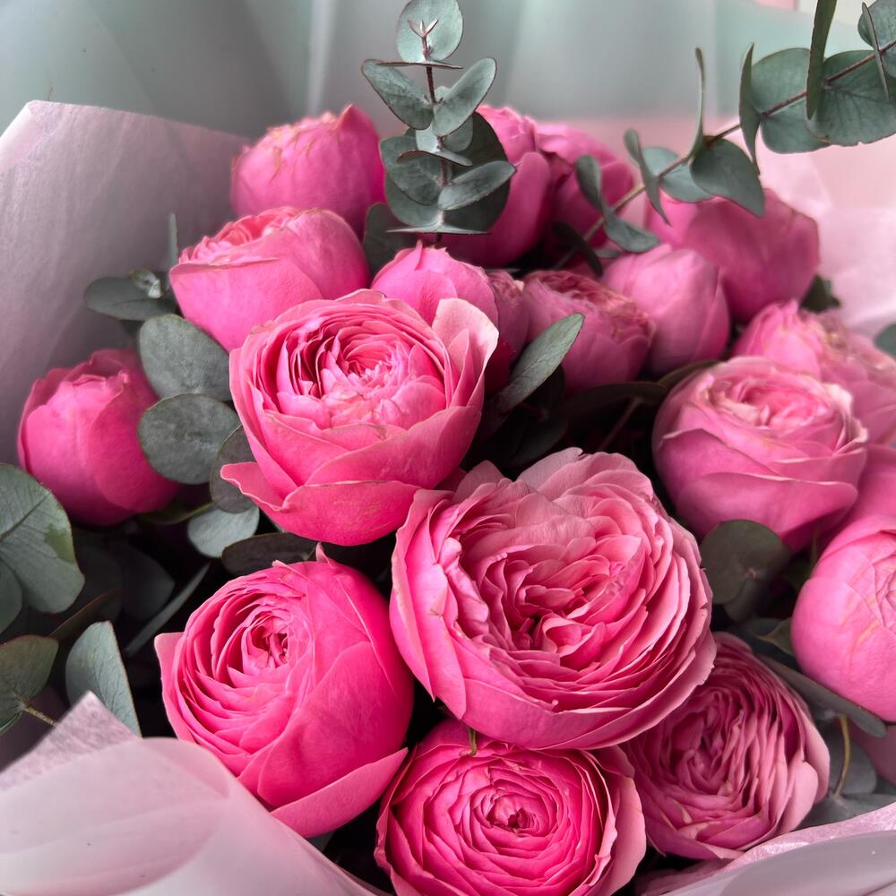 Букет из кустовой розовой пионовидной розы и эвкалипт