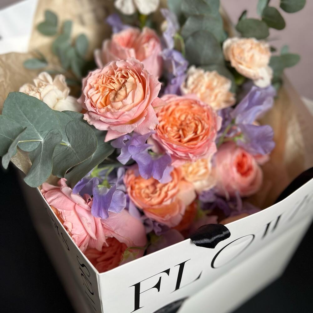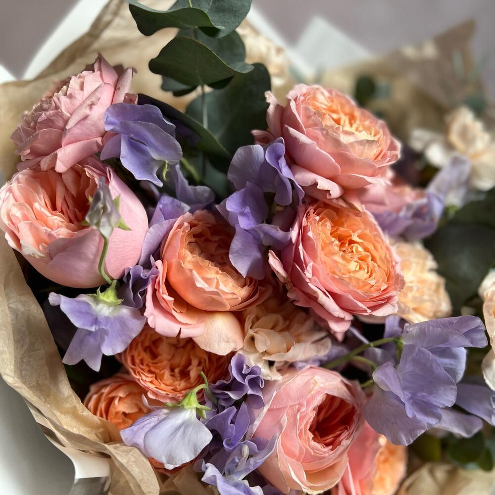 Кустовая пионовидная роза – 3 шт.Пионовидная одноголовая роза – 3 шт.Латирус – 15 шт.Эвкалипт – 3 шт.декоративная упаковка – 1 шт.Атласная лента – 1 шт.