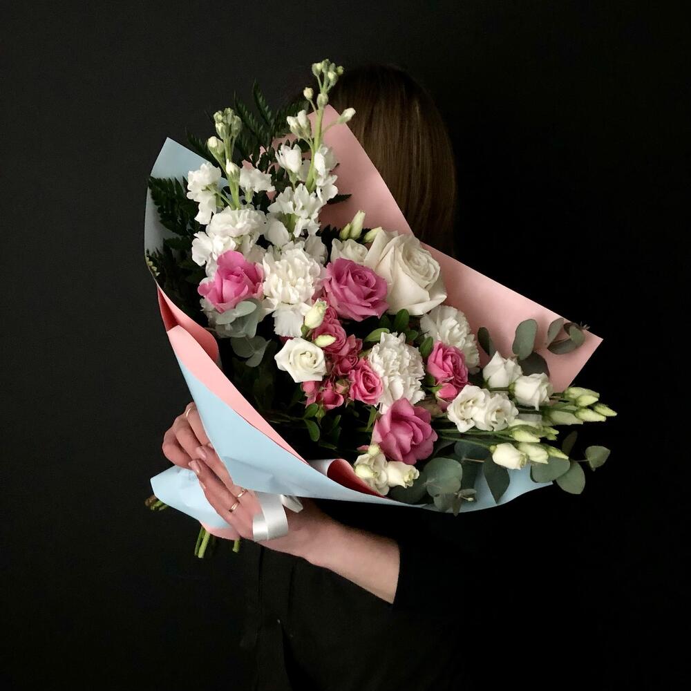 Маттиола – 2 шт.Роза кустовая – 2 шт.Эвкалипт – 2 шт.Роза – 3 шт.Диантус – 3 шт.Фисташка – 3 шт.эустома белая – 2 шт.Эквадор роза – 1 шт.Дизайнерская упаковка – 2 шт.