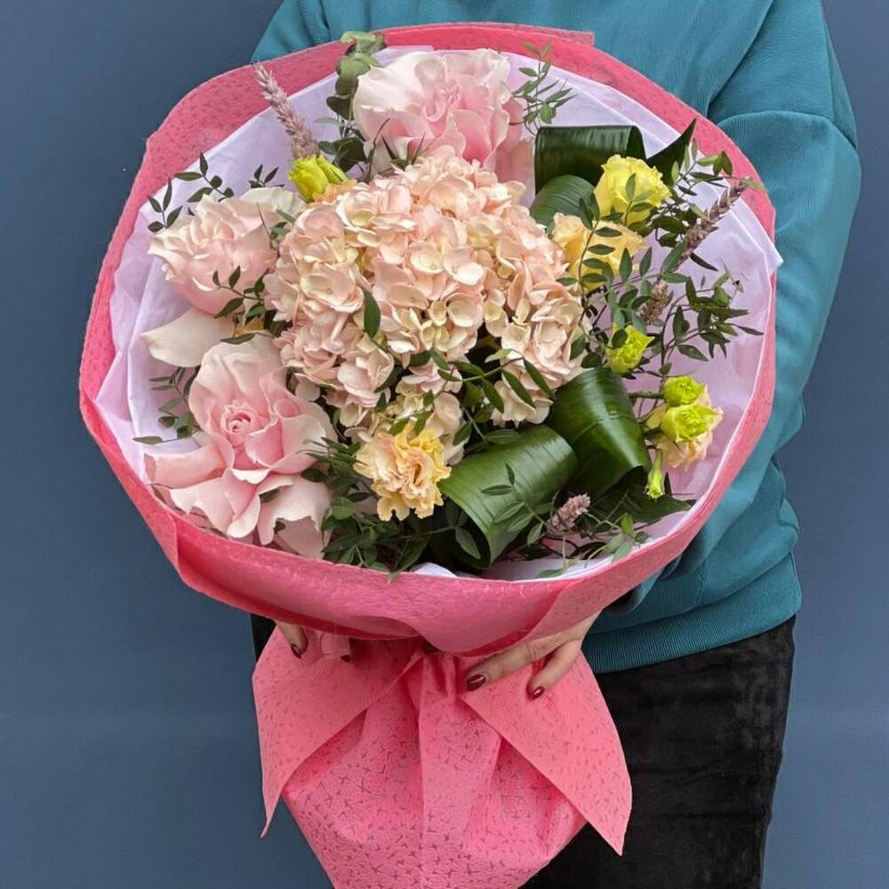 Гортензия – 1 шт. Роза голландия – 3 шт. Эустома – 3 шт. Аспидистра – 3 шт. Эвкалипт – 2 шт. Фисташка – 5 шт. Декор – 3 шт. Упаковка дизайнерская – 6 шт. Лента – 1 шт.