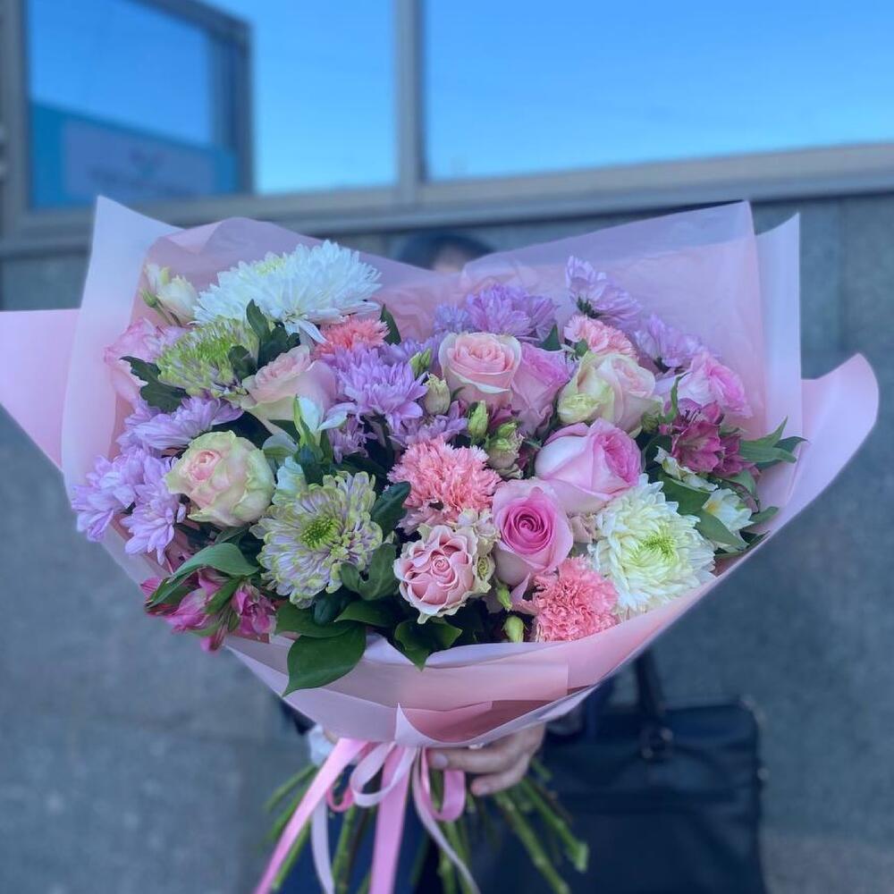 Альстромерия – 5 шт.Хризантема кустовая – 4 шт.Роза – 9 шт.Эустома – 2 шт.Лента атласная – 2 шт.Диантус – 5 шт.Хризантема одноголовая – 4 шт.Упаковка дизайнерская – 4 шт.