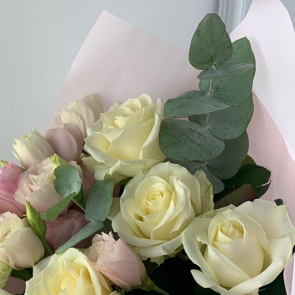 Лента – 1 шт.Лизиантус – 2 шт.Эвкалипт – 3 шт.Роза 50 см – 7 шт.Матовая пленка – 1 шт.