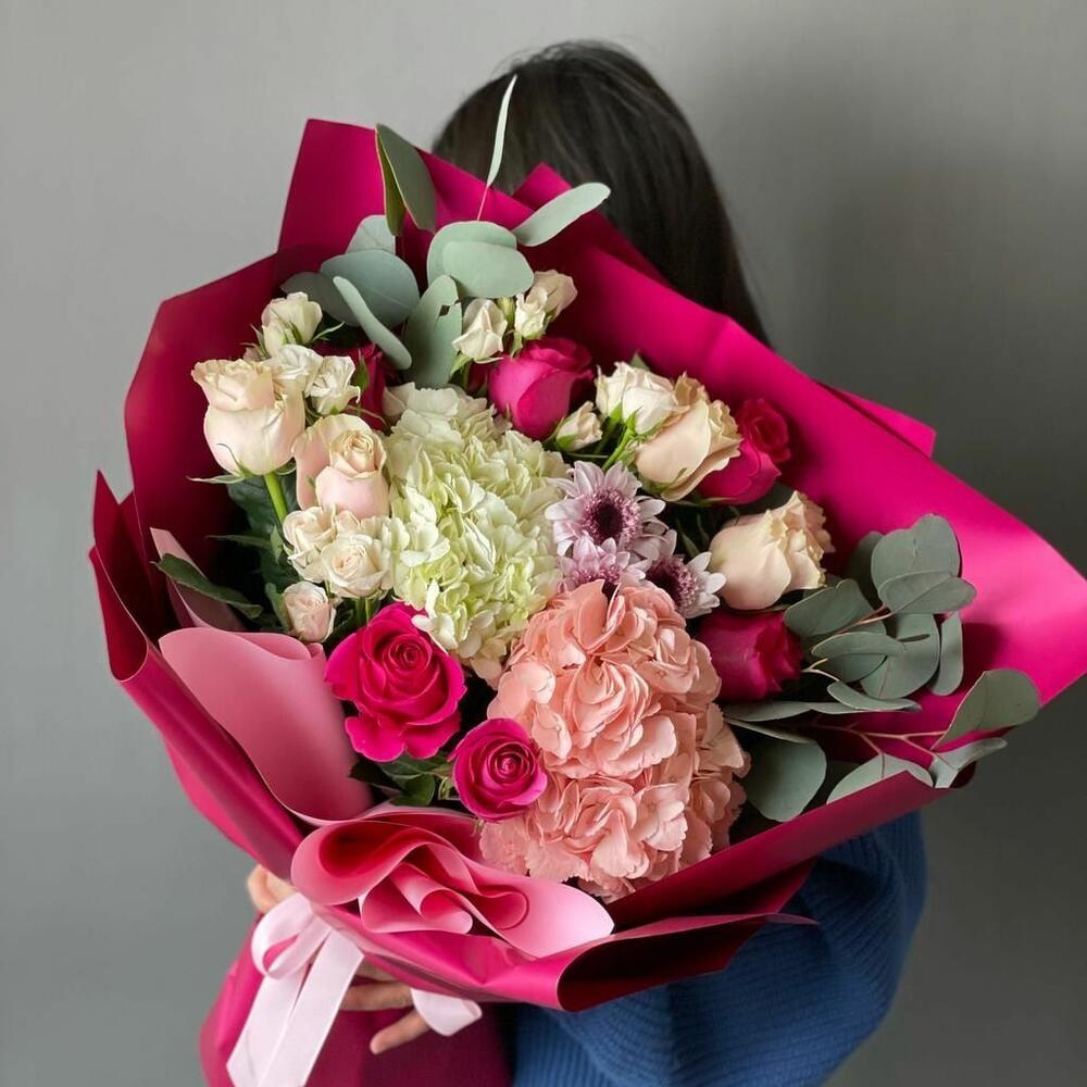 Альстромерии, Гвоздики, Кустовые розы, Лизиантусы, Розы, Хризантемы