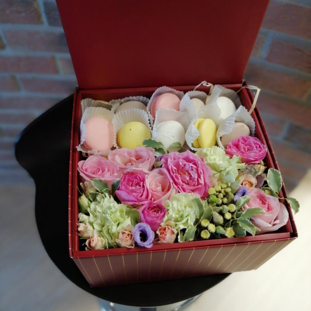 Лизиантус – 1 шт.Роза кустовая – 4 шт.Роза одноголовая – 4 шт.Диантус – 3 шт.Коробка бархатная – 1 шт.Оазис флористический – 1 шт.макарон (пирожное) – 10 шт.Карточка для подписи – 1 шт.декоративная зелень – 1 шт.кустовая садовая роза – 1 шт.кустовая хризантемасантини – 2 шт.