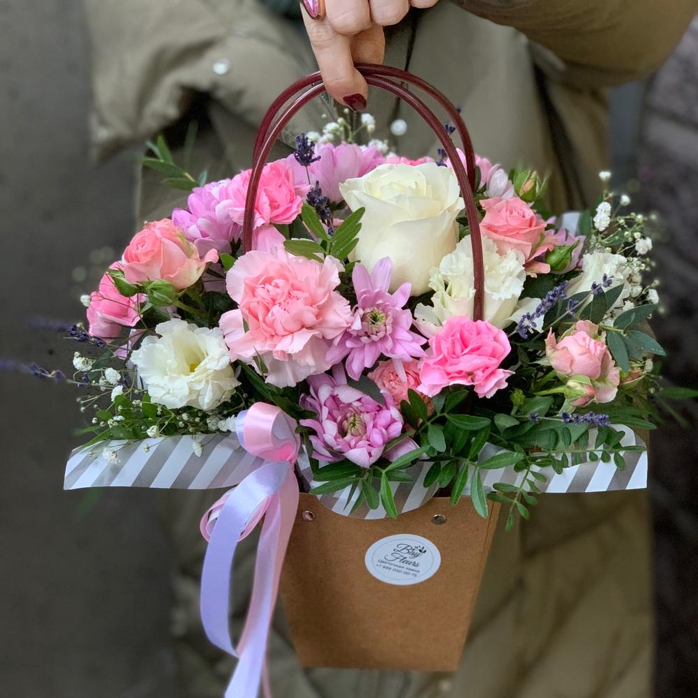 Сумка крафт – 1 шт.Оазис флористический – 1 шт.Роза – 1 шт.Гвоздика – 1 шт.Гвоздика кустовая – 1 шт.Хризантема кустовая – 1 шт.зелень декоративная – 1 шт.Эустома – 1 шт.Лента атласная – 2 шт.Лаванда (сухоцвет) – 7 шт.