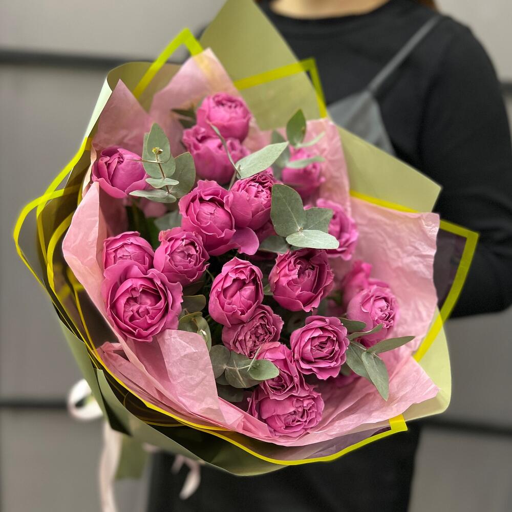 Эвкалипт – 3 шт.Лента атласная – 2 шт.Тишью – 2 шт.Пленка матовая – 4 шт.роза кустовая мисти бабл – 5 шт.пленка дизайнесркая с каймой – 2 шт.