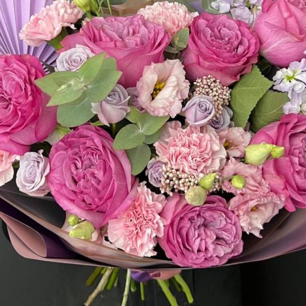 Лизиантус – 2 шт.Маттиола – 3 шт.Озотамнус – 2 шт.Роза кустовая – 3 шт.Эвкалипт – 2 шт.Диантус – 5 шт.Упаковка дизайнерская – 3 шт.Лист пальмы – 1 шт.Эквадор роза – 7 шт.