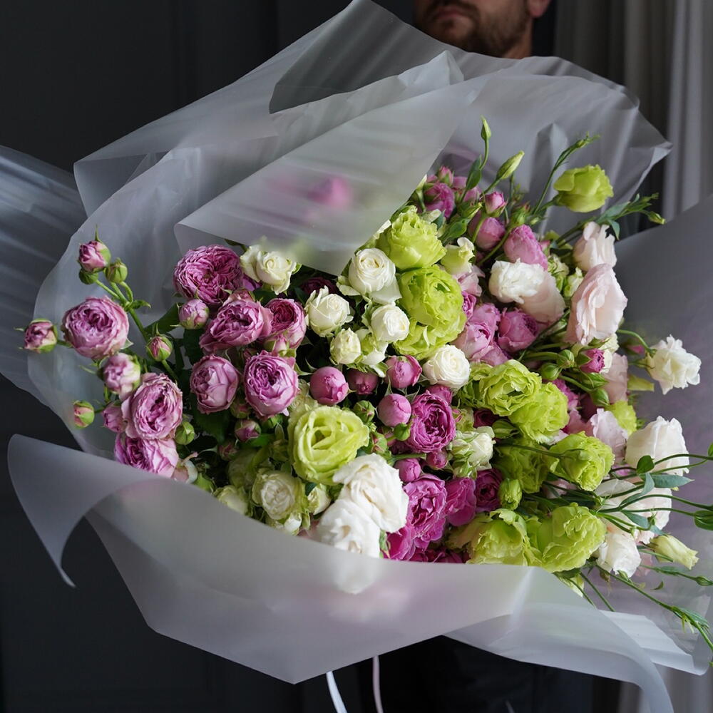 Альстромерии, Гортензии, Кустовые розы, Лизиантусы, Розы, Хризантемы