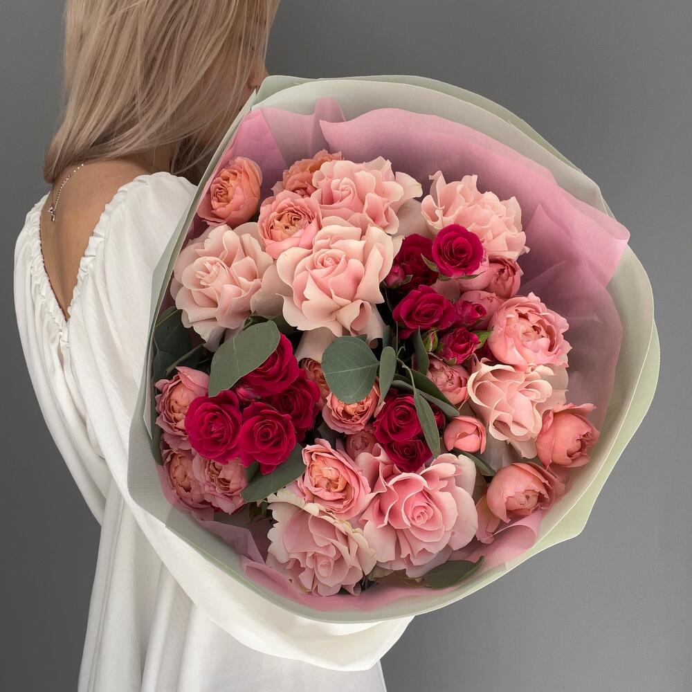 Альстромерии, Гвоздики, Кустовые розы, Лизиантусы, Розы, Хризантемы