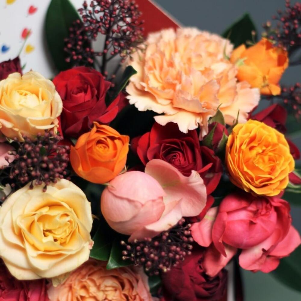 Гвоздики, Лизиантусы, Розы, Тюльпаны