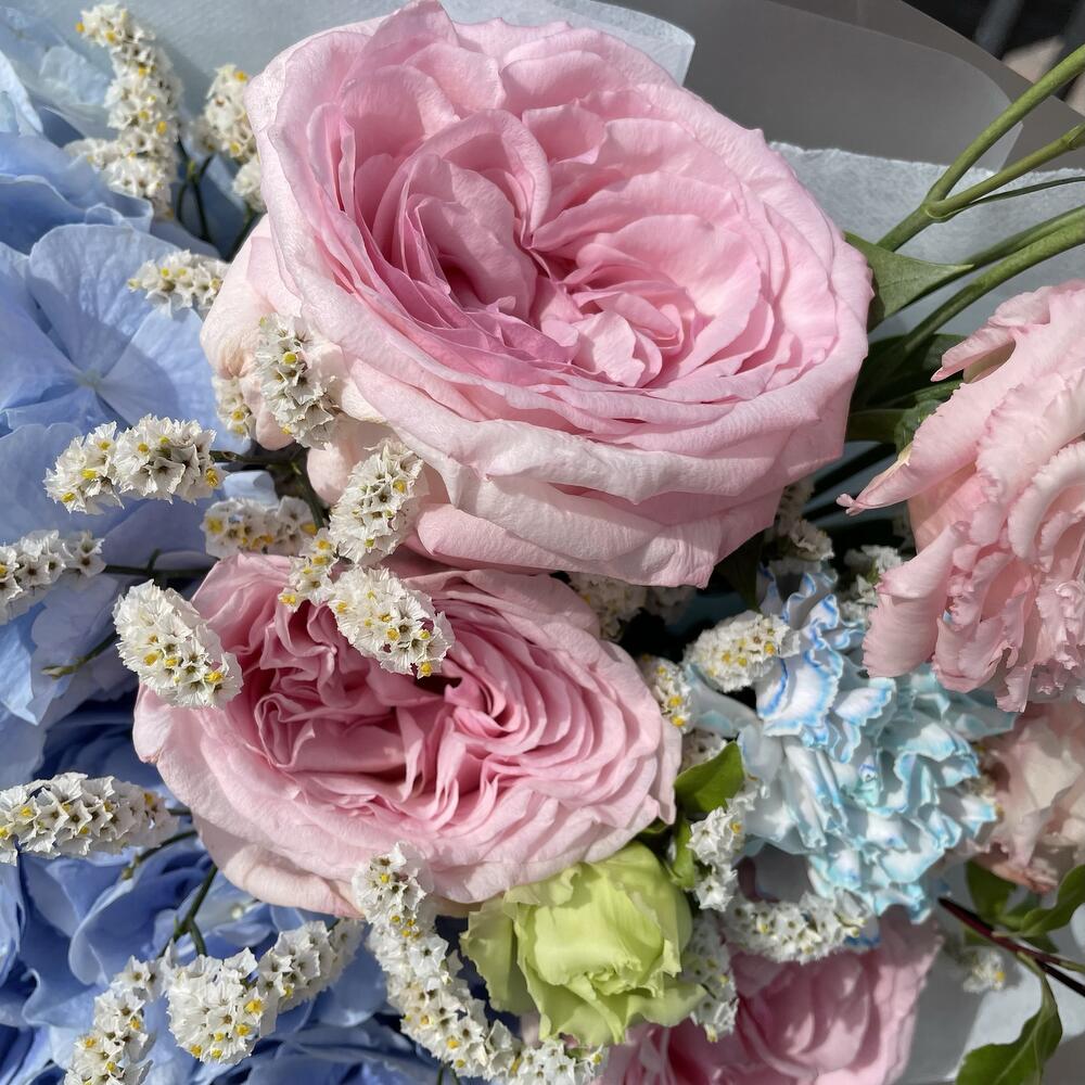 Гортензия – 2 шт.Роза пионовидная розовая – 3 шт.Лизиантус – 1 шт.Диантус – 1 шт.Лимониум – 1 шт.Питтоспорум – 2 шт.Упаковка дизайнерская – 1 шт.