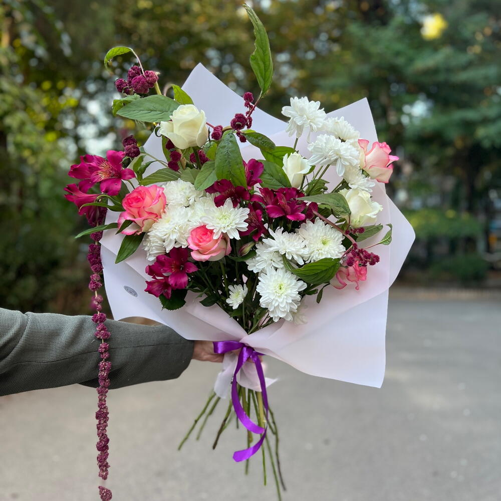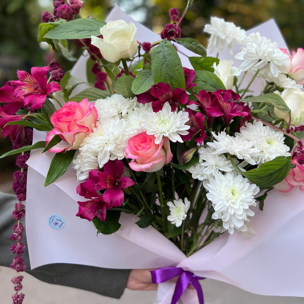 Альстромерии, Гвоздики, Кустовые розы, Лизиантусы, Розы, Хризантемы