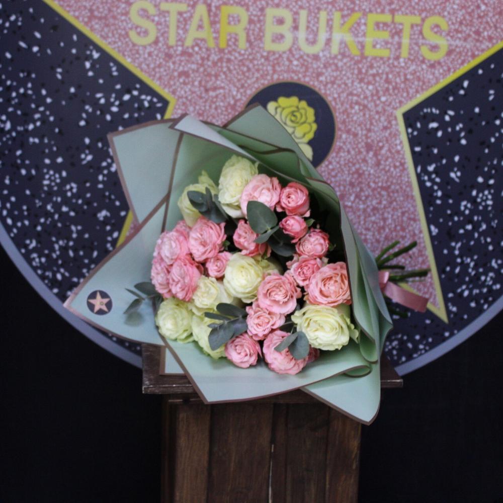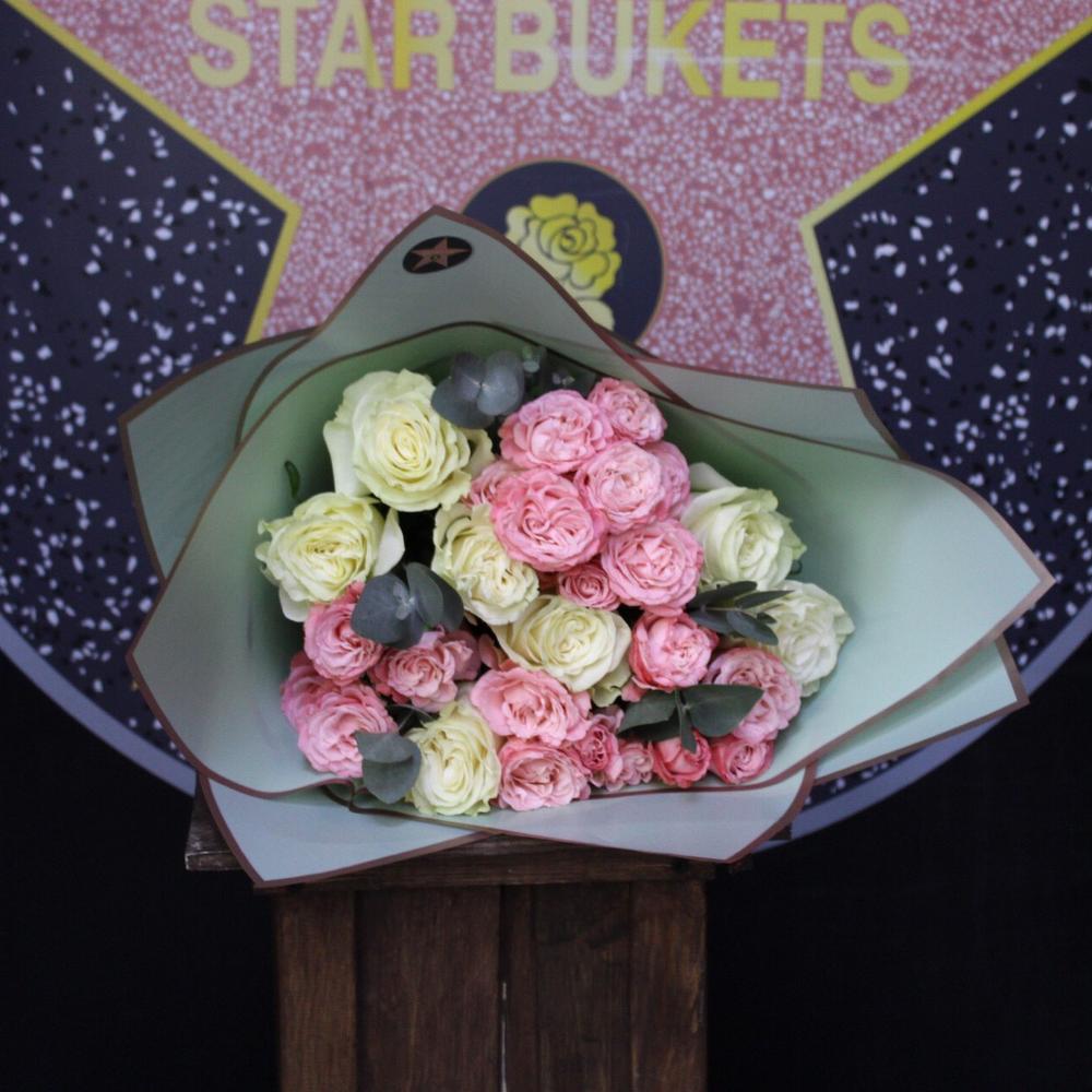 Роза Мондиаль – 7 шт.Роза кустовая пионовидная мадам бомбастик – 5 шт.Эвкалипт – 2 шт.Пленка дизайнерская – 2 шт.Лента атласная – 1 шт.