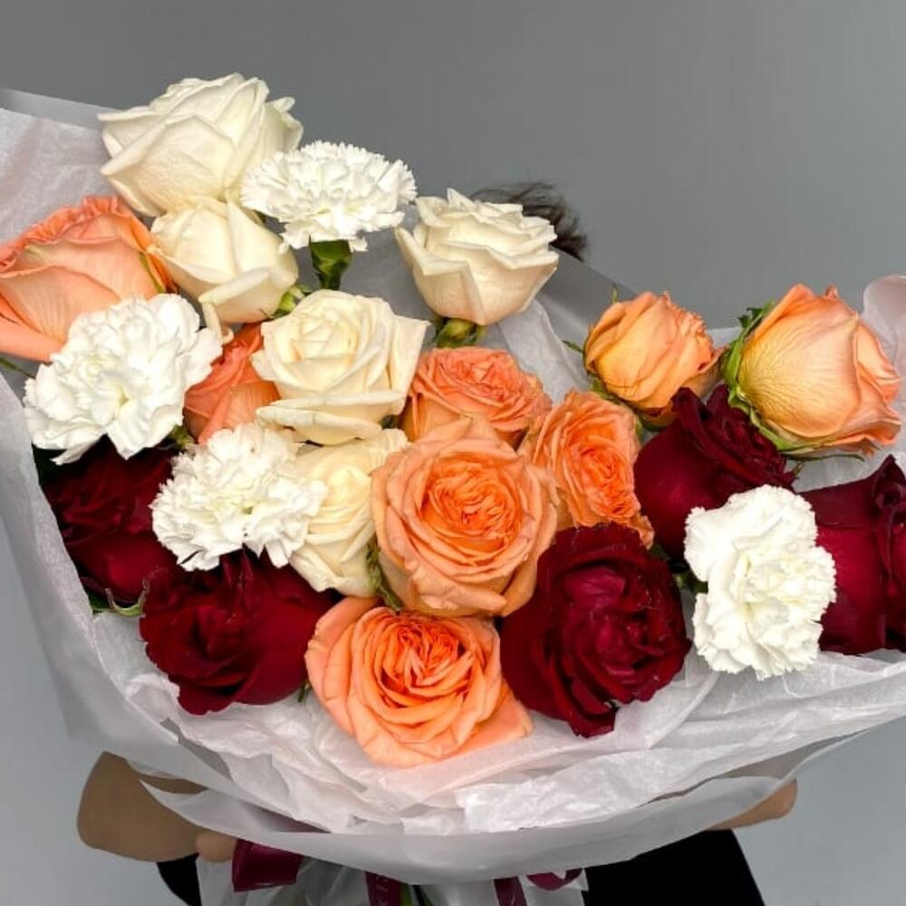 Альстромерии, Гвоздики, Кустовые розы, Лизиантусы, Розы, Хризантемы