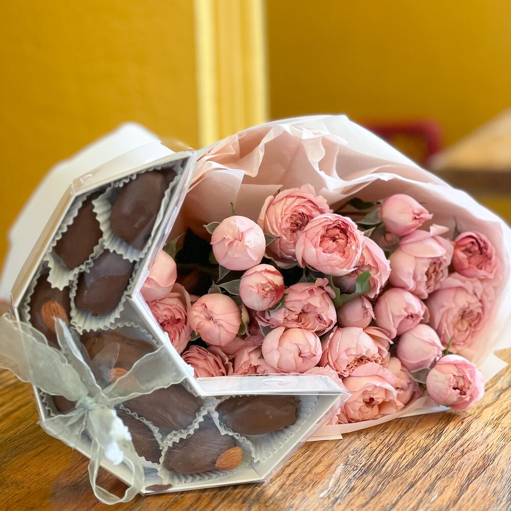 Нежнейший монобукет из пионовидных спрей роз в премиальном оформлении + коробка королевских фиников в бельгийском шоколаде