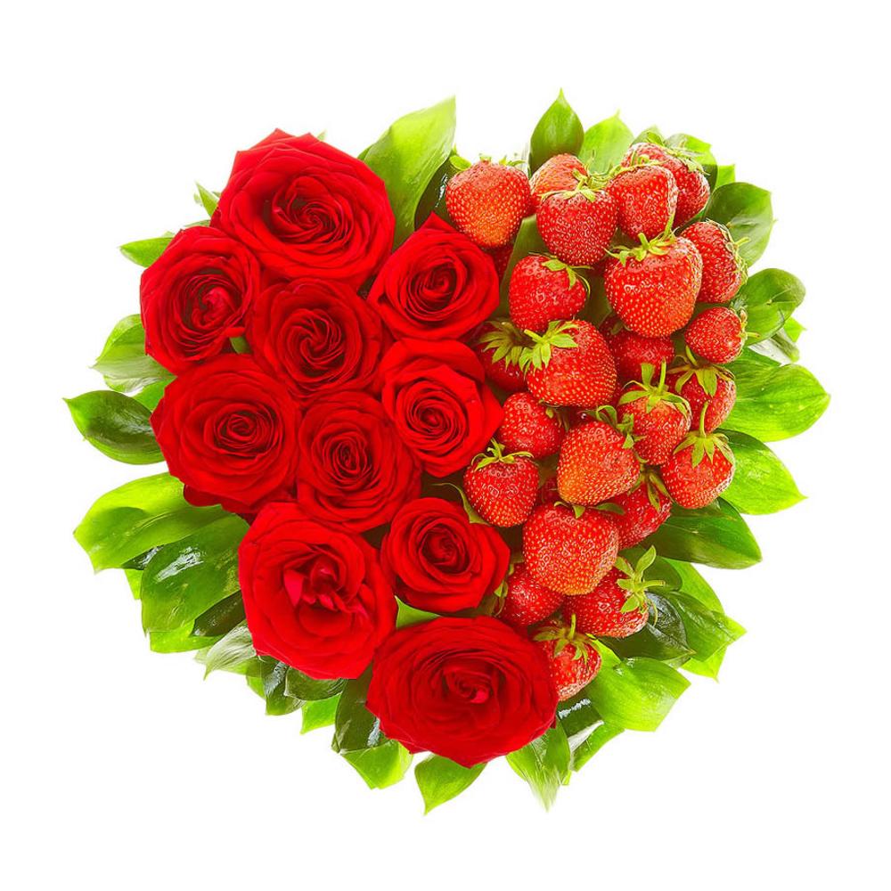 Сердцеобразная композиция состоит из 11 красных роз и клубники. Размер 25×25 см.