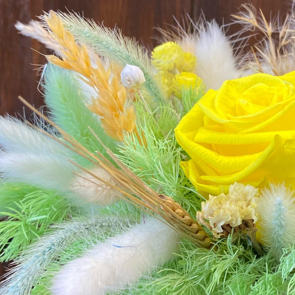 Сухоцветы – 10 шт.Роза стабилизированная – 1 шт.Лагурус (сухоцвет) – 20 шт.коаспедия стабилизированная – 3 шт.Кашпо керамическое – 1 шт.