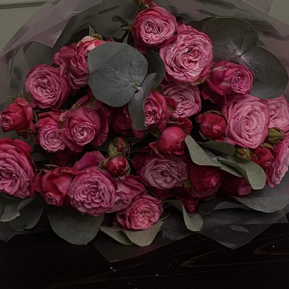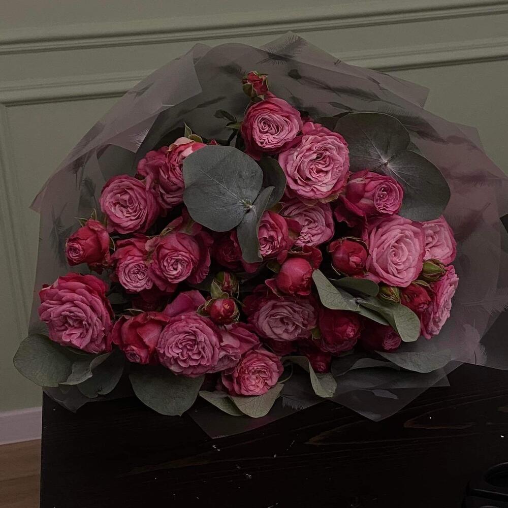 кустовые пионовидные розы – 11 шт. Эвкалипт – 5 шт. Упаковка дизайнерская – 1 шт. Открыточка с вашими пожеланиями – 1 шт.