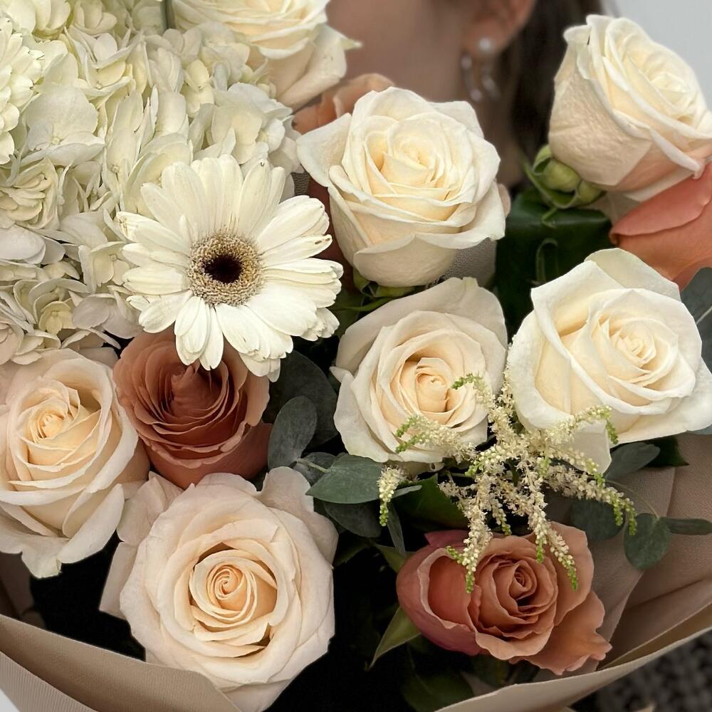 Флористы из студии “Varda Flowers” подобрали свежие и красивые цветы для создания букета, который наполнен положительными эмоциями и любовью. Они тщательно расположили каждый цветок в букете, учитывая его форму и цветовую гамму, чтобы достичь наилучшего гармоничного и красивого результата.
